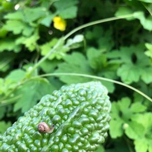 朝、ゴーヤを採りに行くと 曲がったゴーヤにカエルが🐸 初めて見る親指2本分位の プックリしたカエル🐸 その曲がり具合が妙にフィットして椅子のよう 収穫後もしばらくゴーヤを離れませんでした 『あのー、このゴーヤ頂きたいのですが…』と見てたらその場を離れてネットの方へ行きました
