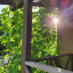 かなり出遅れた昨年のこぼれ種から発芽したゴーヤ 試しに施肥と支柱立て水やりしたところ〜急成長株に😊 poco期待🦆 そんな訳で今日も炎天下草抜き💦と周りのフェンスに絡み付いた蔦を外しました💦orz 周りに人影は在りません〜🙀 373お疲れ様でした😅