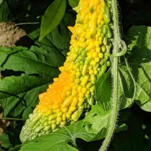 💥爆発間近😰 ゴーヤが緑から黄色になり破裂寸前‼️台所で破裂したら大変です。外に出してパチリと撮影😅 割れるとオレンジ色の種が出てくるんですよね。食べる方もいらっしゃるようですが、私はちょっと❌