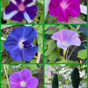 昨日の朝顔とゴーヤです♬ 緑のカーテンはスケスケですが〜お花が咲いてうれちー😆 ゴーヤはヤワヤワ〜佃煮にしました😋