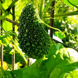 フェンスに絡まって 手のひらにのる程のゴーヤ ウリ科 ツルレイシ属