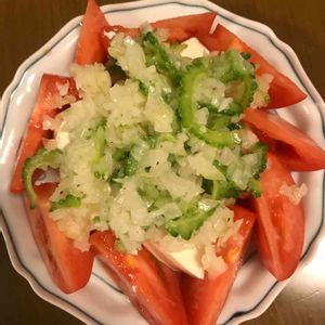 こんにちは 今年の夏は勝手に出て来たトマト🍅を 13個も収穫出来ました👏助かるわ〜😍 ミニトマトは育てた事があったけどトマトは無い。 去年の夏に🍅の痛んだ部分を土の栄養になるかと ポイしたかも知れないけど‥その種から❓ そんなトマトの鉢に今度は7月上旬にゴーヤらしい 新芽を2つ発見👀1つは虫に食われて消えて 生き残りの1本のゴーヤがもうこれ以上は大きくならない 約12センチだけど本日収穫しました。 去年育てていた『沖縄ゴーヤ』だと思います。 買った苗の土に種でも発芽しないで残っていたのかな❓ 二度あることは三度ある❓ 何か美味しいものが実と嬉しいです😆