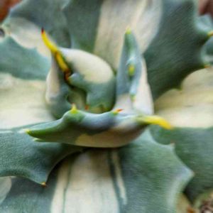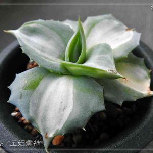 アガベ・王妃雷神。ちょうど1年前に買った時、買ってすぐに下葉が枯れてしまい、長らくバランスが崩れていましたが、やっと整ってきました。でも「濃厚クリーム斑」ということでやや黄色みが買った斑入りだったのに、普通に白くなってしまった……。色を元に戻す方法はないものか。