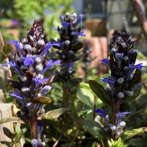 アジュガ・チョコレートチップ 咲き進むと… 花の色は綺麗だけど チョコレート色の葉っぱや茎が 少しずつ緑色に近くなるのが残念🥹