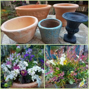 我が家で唯一の寄せ植え用のデカ鉢とフローラ黒田園芸さんのワークショップで作って来てからずっと空だった椅子型のプランターに春まで咲いてくれるであろう花を詰め込んでみました😁 株分けした苗や挿し芽をした苗など余り物をいい加減に~🌿