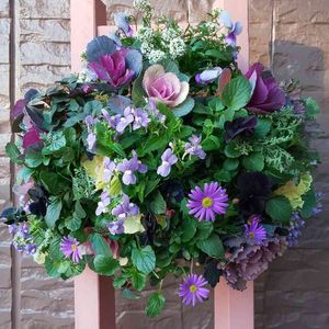 私が作ったハンギングのケース買いビオラの余りで娘もハンギングに初挑戦。 葉ものが足りなくて庭のあちこちから引っこ抜いて入れてました😁 一番上には高級なビオラ、つぶらなタヌキさんが鎮座してます😜