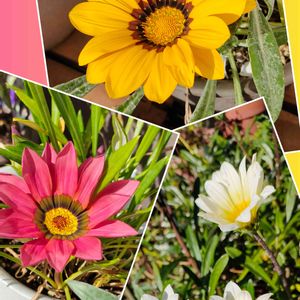 💛🤍❤️ガザニア3色💛🤍❤️ 上の黄色のは葉が白いのよ! ピンクのガザニアも珍しいよね😃 明日は一日中の、雨になりそう💦 花も急いで咲いてくれたのかな☺️