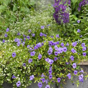 PWの花でいっぱいの 夏色ガーデン 株間を開けたのに サルビアロックン・ロールが生育旺盛 でアンゲロニアが飲み込まれそう! トレニアカタリーナブルーと ヘリオトロープブライドパールは 地面が見えなくなるまで大きく生育 してます!