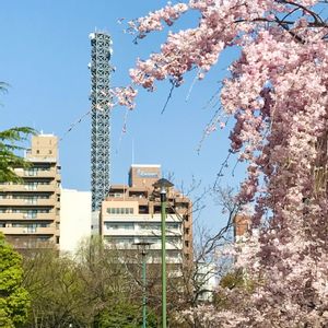 枝垂れ桜が満開🌸 屋台のテントとビルが新世界✨ 向こうの電波塔⚡️は中部電力のもの デジタルVSアナログw