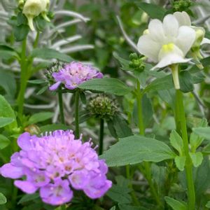 切り戻したネメシアとスカビオサのコラボ 涼しげに咲いてる。 雨も風も何のその ポストの下で微笑むように🤍💜🌿 郵便屋さんに、いつもありがとう❣と 伝えてね😉💕