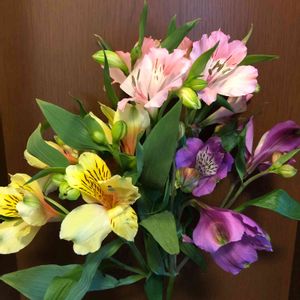 おはようございます¨̮♡︎ アルストロメリア✿︎ ピンク、黄色、紫バラバラの色合いも そんなに変じゃ無いかも‧˚₊*̥(∗︎*⁰͈꒨⁰͈)‧˚₊*̥ 日陰の玄関が華やかになって良かった〜¨̮♡︎❣️