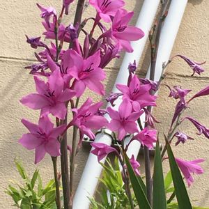 🌸ワトソニア・ボルボニカ アヤメ科 ワトソニア属 南アフリカ原産 グラジオラスをシンプルにしたような感じの花が咲く 花被片は合着して筒状になっている。緩やかなカーブを描いていますが蜜を吸い、花粉を媒介する鳥のサンバードに合わせた作りだそうです