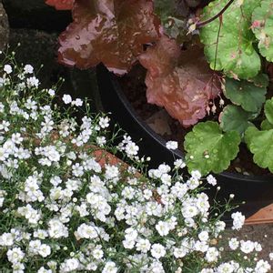 雨に濡れた ☘️ヒューケラとかすみ草☘️ 相反する色が素敵です。 皆さん、雨大丈夫でしょうか?