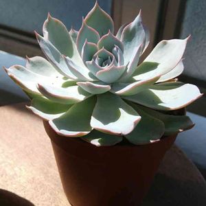 おはよーございます🌞 帰宅頃やって来るらしい台風台風対策で、出勤前に多肉棚や観葉植物の移動! ムシムシMAXで朝から汗かいた(; ̄ー ̄A 今日の子はカナディアン✨ 数少ないエケのお一人様😆 お一人様コーナーが狭すぎて、ここには寄せ植えにするのが怖い白い子ばかりいます😁 先週はこの子の隣のファンファーレが元気に徒長してたので、慌てて日当たり一番のポイントで日光浴🌞 お粉たっぷりの薄い水色に、これまたうっすらピンクのエッジ( *´艸`) カワイー:*(〃∇〃人)*: