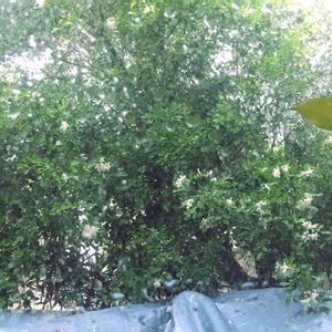 台風の真っただ中。 雨戸のない窓から見えるゲッキツの花。 高いところに咲いているので、下を通ると香りがするが、ゆっくり見上げることもなく…こんなに咲いていたなんて。 台風の風から、このゲッキツの木が守ってくれてる…と、不思議な気持ちで眺めています。 どうか各地の被害が少なく済みますように…