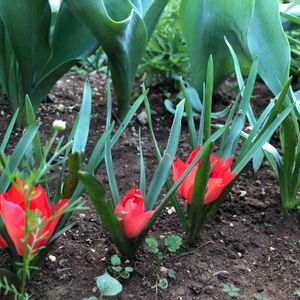 ミニチューリップ🌷咲き揃いました❣️ バックに普通のチューリップの葉っぱがあります。花の下が伸びていないのがいいなぁ〜🤣🥰🥰