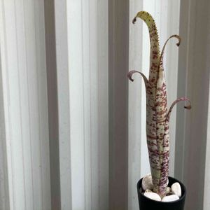 ついに、ディッキア様、いらっしゃいました🙌🏻 えーっと お名前が Dyckia marnier-lapostollei Large form X “Snow storm” ディッキア マルニエル ラポストレイ ラージ フォーム スノーストーム で、読み方あってるかな🤔 ヒロskmt先生のプレ企画❣️∩^ω^∩🎶 昨年、11月のネオレゲリア里親企画で、いただいた株達も、子株が出て成長中です❗️ 初めて至近距離でマジマジ見たら、トゲトゲマーク(ウォーターマーク)が、あってモケモケ葉っぱ😻💞🎶 手の平サイズなのに、存在感が半端ないよ❣️💞 ディッキアって、ツルッとした葉っぱと鋭利なトゲが、イメージだったから、ちょっと嬉しい😆びっくり仰天‼️ モケモケ生えてるからトゲもソフト😸🎶 長旅で、お疲れ様だったけど、ヒロ先生のアドバイスどおり腰水で明るい室内に置いてたら、元気が、出たみたいです😽🎶 ありがとぉ〜ございました🙇♀️ ネオレゲリア同様に大切に育てます😁✨ 今日は、 11月29日 いい福の日だからねーϵ( 'Θ' )϶
