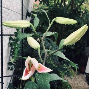 朝から雨が降ってます☔️ カサブランカの蕾が開き始めてました🥰 白だと思っていたら花の中からピンクがのぞいてます💖