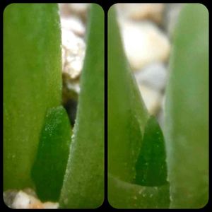 ハオルチア(玉扇)です。 種まきから325日目の。左側が恐らくは4枚目の葉で、右側が恐らくは5枚目の葉になります。右側には窓みたいな透明色の艶美な窓があります。。 他のページで徐々に窓の形が鮮明化していく生長段階の写真がありましたから、この幼苗もそうなると思います。 どんな形かな^^?