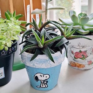 ハオルチアのエノン✨ 子株が増えて、群生になっています🎵😃 白いドットは、拡大してみる🔎と、けっこう立体的❕ 手書きスヌーピーの鉢に植えてあります。😄🎶