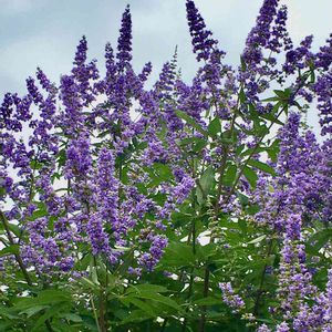 お花が咲いているのはテッペン🔝 先っぽは曇り空に吸い込まれて… 大好きなお花、セイヨウニンジンボク💜