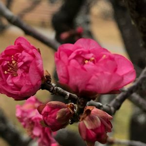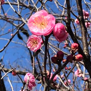岡崎南公園で見つけた新春にぴったりのこの早咲きの紅色で八重咲きの梅! その名前が、見た人が驚いたという美しさ🌸 「見驚」という名の梅