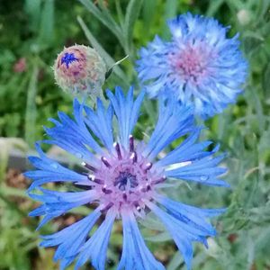 7月14日 My Garden ネモフィラペニーブラック咲いていました やはり小さいです😅 真ん中が6月に咲いたマクラータ 咲く時期でこんなにも大きさが、違います (何故か写真が逆さま(๑• . •๑)??)