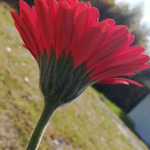 買って来た切り花シリーズです 今日は赤いガーベラです 🌼🌼🌼🌼🌼 夕陽にかざして見ました 後ろ姿を📷・・・ 陽に透ける花びら綺麗です✨✨