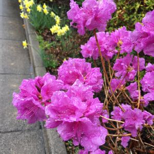 お隣の花壇をパチリ 今日は暴風雨警報が出ています。🌧🌧💦 函館は春先、真っ先に水仙とこの紫ツツジが道路沿いを彩ります。🌸 この後、いよいよお花の季節がやってきます❤️❤️😊 自粛中、癒してくれます^_^