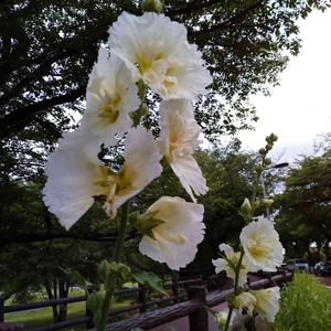 今朝の散歩道です。 散策中、今年初めてタチアオイを、其れも白いタチアオイでした。 松浦の鐘の近くの、道路に咲いていました。