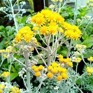 今朝の散歩道です。 ☔の中、散策して帰り道に通ったお宅の花壇に、シロタエギクが開花していました。