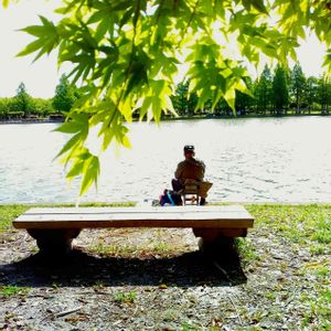 今朝の散歩道です。 紅葉の向こうに、 釣り人🎣が…。