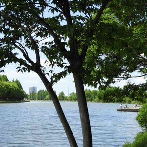 今朝の散歩道です。 水辺の景色を撮ると、枝の間にスカイツリーが有りました。
