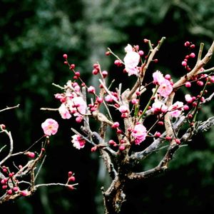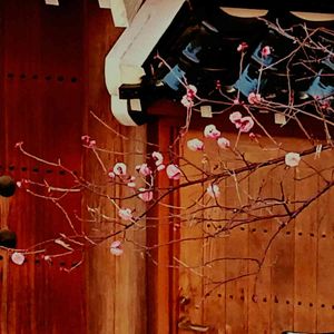 散策中に、通り道の農家さんの門戸の前に、白壁塀を乗り越えて紅梅が、咲いていました。