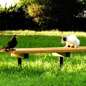 以前、水元公園で、烏とネコ😼ちゃんが、同じベンチにいました。 ネコ😼威嚇して😡、カラスは知らん顔です。