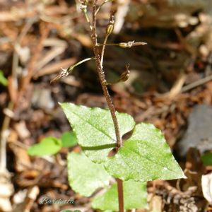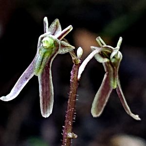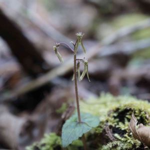 ヒメフタバラン(姫双葉蘭) 山地の林内の常緑広葉樹や針葉樹林の林床に生える 花期 3〜5月 高さ 5〜20cm 茎の途中から対生する三角形の葉が2枚つく(1〜1.8cm) 上部に2〜6個の花を咲かせる 茎は葉から上がやや細く、白っぽい腺毛が生えている 花はハサミの先の様にY字になっているのが唇弁(緑紫色で6〜8mm) 唇弁の基部には小さな突起があり柱頭を支えている 萼片は3個で、背萼片が1個、側萼片が2個(斜め上につく、約2mm) 山で互いに情報交換した方からこの場所を教えてもらいましたが、1人では見つけられなかったくらい、小さな植物です しかも地味なので知らないと見過ごします