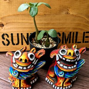毎月3、4日は 🏷️みしょり隊🌱 4月3日は 🏷️シーサー祭🦁 🏷️シーサーの日🦁 去年の3月初旬、ドルステニア・ヒルデブランディの種子を蒔いたけど全く発芽しなくて💦 諦めて随分経った頃に発芽しました😳 小さいけどお花を咲かせてます✨ 今日は4月3日☝️ 毎年過ぎてから気付いて参加出来ずにいた🏷️シーサーの日🦁初めて参加しますッ‼️🙋 何年前かな? 17年前位。。。 沖縄で気に入って購入したシーサー♪ 色も表情も めちゃめちゃ沢山のシーサーの中から迷わず決めた位、ドンピシャ私のタイプのシーサーなんです😆 熊本地震でオスのツノとメスの耳が少し欠けましたが、それでも陽気に笑ってる💕