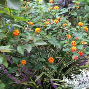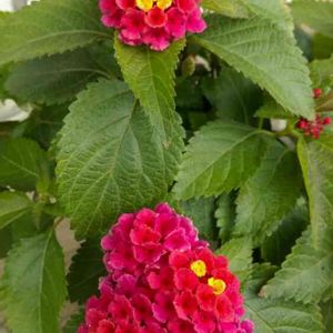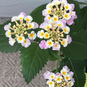 黄色一色の花はレモンランタナです。その他は全て同じ一つの株から咲いているランタナ七変化です。この七変化は中央の黄色い部分がしばらく経つと周りと同一化し、よりピンク色が濃くなります。レモンランタナは葉っぱを指先で軽く擦るとレモンのような匂いがします。