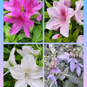 💗🩷🤍うちのヒラドツツジ3色 と、花の咲いたツリージャーマンダー💜 毎年、消毒の効きも悪く 少ししか咲かないヒラドツツジは 花も大きくて見応えあります🤩 花が終わったらすぐに切り詰めてますが その後、また大きくなってしまい また切って、花芽を落としてると思います💦 💜ツリージャーマンダーは 一年中葉の色が🤍白くて素敵! 花はオマケの感じで 葉が主体で育ててます😙