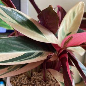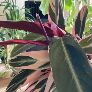 ストロマンテ トリオスター おしゃれ観葉植物の代名詞ともいえる(勝手に思ってる)トリオスターちゃん。 3月に退職した部長さんが飾っていたものをいただいた。 他にもパキラとか漫画とかウルトラマンフィギュアも😂 1枚目 3/27 我が家へ来た時。美しい😍 2枚目 6/7 新葉も展開。 3枚目 10/5 はいボロボロ😭 夏の間に何があったのか。 一度水切れっぽいことがあったような気がするけど、それかなぁ。 カラテアとかクテナンテは水切れからも復活するイメージあるんだけど、明らかに水が吸えてない感じになってしまった😥 あと葉が緑緑してきて斑が消えかけてる😭 全部緑になってしまったら悲しすぎるので株分け&植え替え。 4,5枚目 11/12 鉢密閉で約1ヶ月。 スリット鉢から脱走根が出るくらい根は張ってきました! 新しい葉や芽も出てきたし、斑入りな雰囲気。 葉は小さくなったけど生きていれば🙆 引き締まった株にするぞ〜。