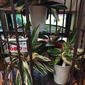 ストロマンテ トリオスター ブラジル原産らしい 葉の表は迷彩チック 裏は濃いめピンクで表の葉模様が透けて見えます。 写真は展示を撮影 もちろんお迎えしましたわ。 トヨサトガーデンにて。