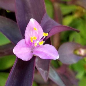 紫御殿 晩春から秋に濃い紫色の太い茎先に、 紫の長い葉に守られるようにピンクの 小さな3弁花が朝開きます。 紫一色に保たれる葉や茎の美しい姿をたとえたものでしょう。 別名::パープルハート セトクレアセア