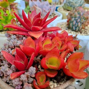 新しく仲間入りした多肉植物 ・月の王子 ・ブロンズ姫 ・千代田の松 ・虹の玉 ・静の舞 奥は制作途中の箱庭