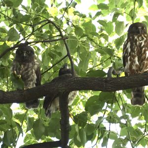 ☀️おはようございます🦉 前日投稿したアオバズクの雛が巣から出てきました🎶今年は3羽産まれたようです。まだ親鳥がついて、巣立ちの練習中のようです。 雛と言っても、まぁまぁの大きさですが、ポヤポヤの羽が可愛い〜🎵 ❶アオバズク:子、子、親 ❷アオバズク:子(ポヤポヤ) ❸アオバズク:子、親 ❹近所の鎮守の杜 ❺クスノキとアオバズク