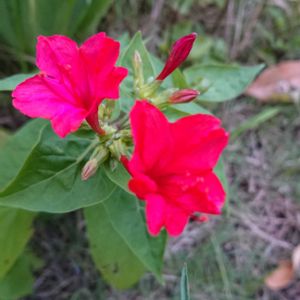 こぼれ種から毎年咲いてくれるオシロイバナ😊 去年四色の種を撒きましたが、今年最初に咲いたのは赤😊 実家では、マゼンタカラーが😊 毎年見事に咲き誇る花です😆😊👍 ホタルフクロもまだ咲いてます😊😊
