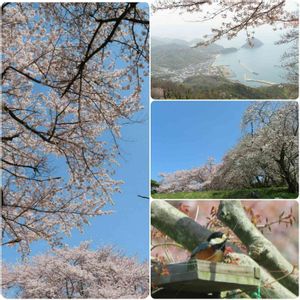 「紫雲出山のサクラ」2 満開のサクラと瀬戸内海を臨む大展望をもう1枚。 可愛いヤマガラさんとも出会えました(右下)。 撮影日 2021.3.31