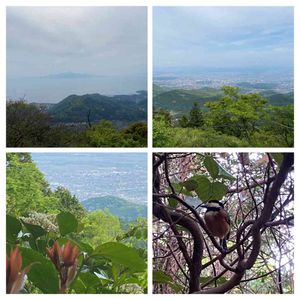 熊本 金峰山に登りました⛰ 2022.5.4日 駐車場から ゆっくり登り50分頂上に着きました。 ↗️東 熊本市内街中方向 阿蘇山 ↖️西 長崎 雲仙普賢岳 ↙️南 熊本市 南区方面 ↘️ヤマガラ 薄曇りで うっすらと普賢岳が見えました。 海の向こうは長崎県です。 金峰山の標高 665m 熊本市民なら 誰もが一度は登った事のある山です。 私は ヤマガラ 知らなかったんです。 帰って調べました。 人懐っこいヤマガラで 1mぐらいの近くの 枝に止まり 写真を撮らせてくれました。 このヤマガラ 手のひらに無塩ピーナッツを乗せて待つと 手のひらに乗り食べてくれるそうです。 今度行く時は 無塩ピーナッツ 持って出かけるぞ❣️ 野鳥が手のひらにのってくれるなんて 感激ですね✨❤️