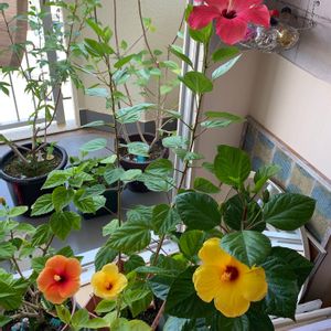暑いのでハイビスカス達もバテぎみ。 花もチリチリになるので 咲いた子は必死に部屋に入れてます。 大きい子は大変デス😅