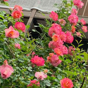 おはようございます!☀️😊 予想外の薔薇🌹さんが上へ上へと伸びているのに気が付くのが遅く慌てて手作りアーチを作りましたが後ろ側、狭い所で上へ上へと伸びています〜!ヽ( ̄д ̄;)ノ=3=3=3 でも綺麗です〜!(╹◡╹)♡