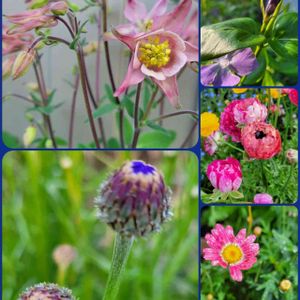 今日のお花二枚目 🏷金曜日の蕾たちに参加 ↖️西洋オダマキやっと咲きだした💗 ⬇️矢車草💜 ↗️ツルニチソウ💜 ラナンキュラスまだ蕾たくさん💛❤️ 挿し木したマーガレット蕾持って来た 可愛い蕾達♡・*:..。♡*゚¨゚゚・